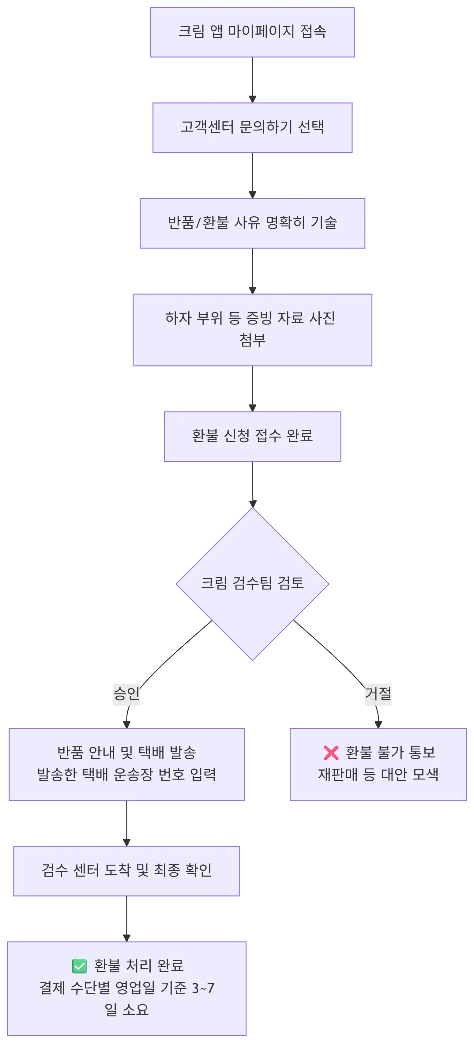 | 오배송 (다른 상품이 배송됨) | ⭕ 가능 | 검수 팀의 확인 후 승인 필요 |